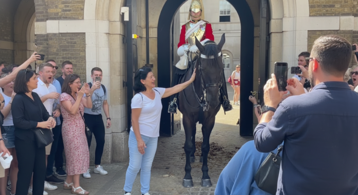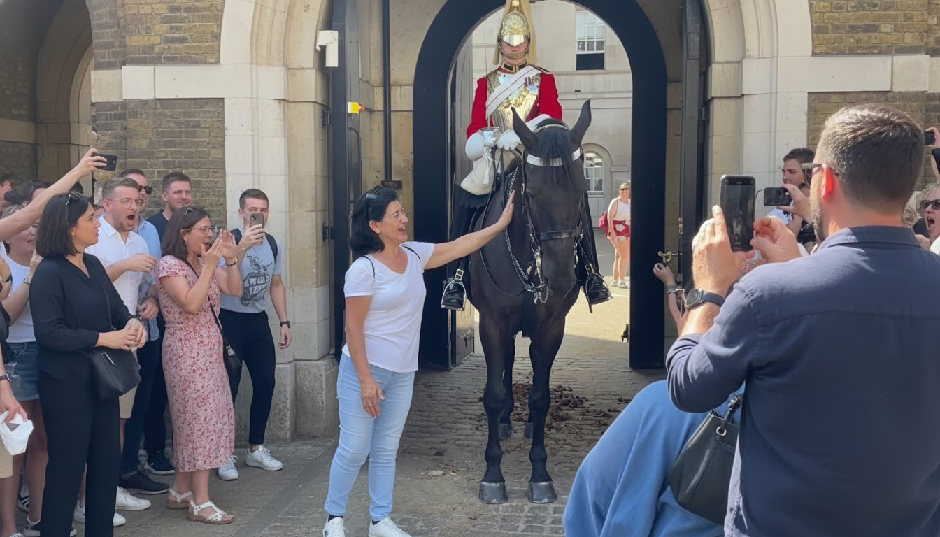 The incident took place as crowds gathered to admire the King’s Guard on horseback, one of London’s most iconic sights. Tourists lined up for photos, maintaining distance—until one individual stood out, drawing the attention of the horse.