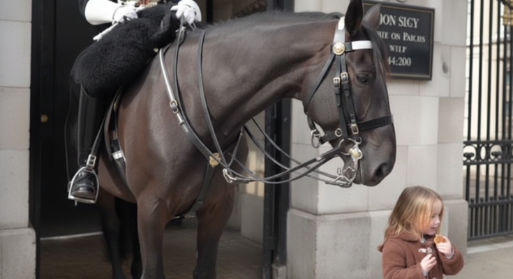 The moment unfolded as crowds gathered to watch the King’s Guard on horseback, one of London’s most iconic ceremonial sights. Among the visitors was a little girl who stood quietly near the horse, clearly fascinated yet respectful. Unlike many who rush in for photos, she remained calm, allowing the moment to happen naturally.