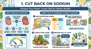 At the same time, try to limit ultra-processed foods, which are often high in sodium and additives. Prioritizing whole foods not only supports heart health but also helps maintain a healthy weight and reduces additional strain on the body.